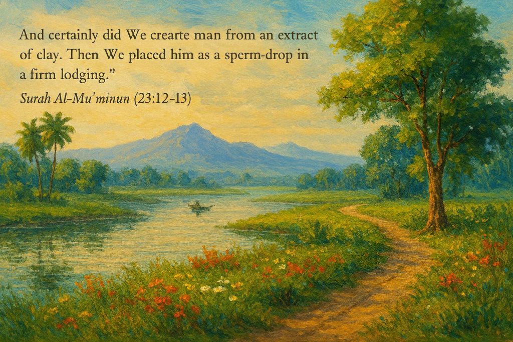 “Thumma ja‘alnāhu nuṭfatan fī qarārin makīn” — “Then We placed him as a sperm-drop in a firm lodging.”